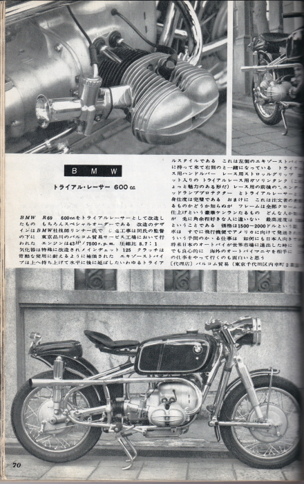 このバイクはBMW R69をレーサー用に改造された車だそうです。すごい高価なバイクですが、一体誰が買ったのでしょうね? 今のレーサーレプリカ風では無いですが、迫力有るデザインですね。