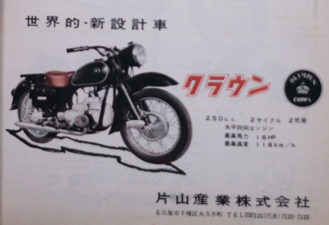片山産業オートバイオリンパス号は、1950年代に名古屋の中堅メーカーであった片山産業が製造したオートバイです。オリンパス号にはいくつかのモデルが存在しましたが、特に有名なのはオリンパス クラウンです。
