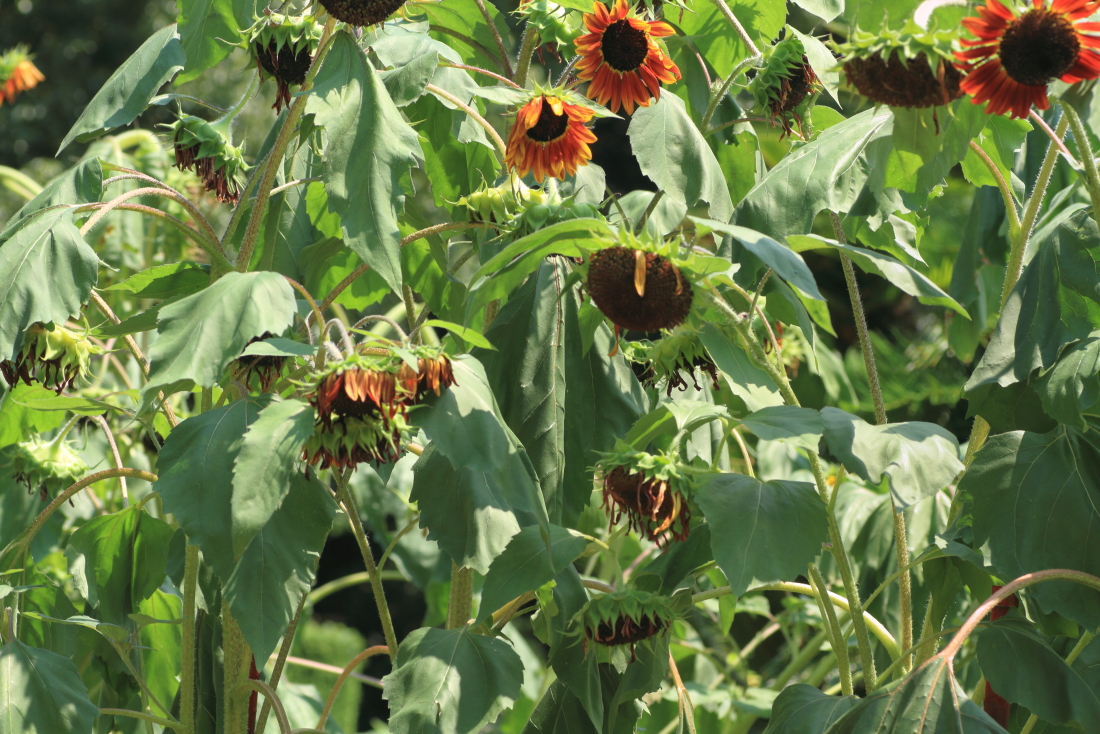 さすがはヒマワリ、この暑い時期でも元気に満開で咲いている・・・・、と思ったら、さすがにこの暑さはヒマワリにもダメージが・・・。あまり元気が無い様子。